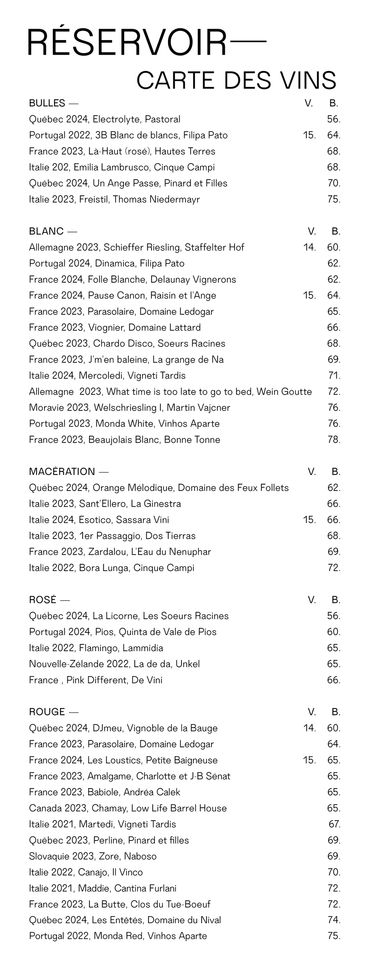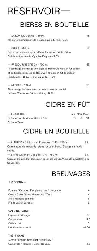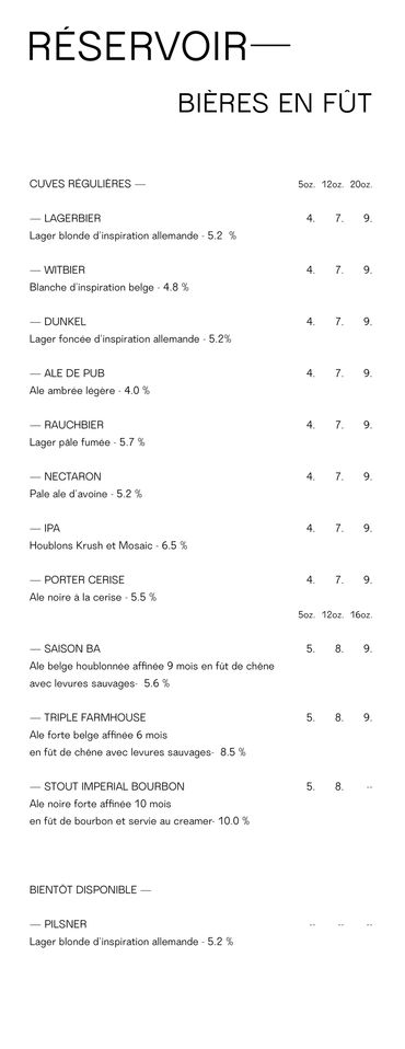 Parmi nos classiques, vous trouverez presque toujours à l’ardoise au moins une de nos quatre bières classiques ayant marqué l’histoire du Réservoir : la Rhubarbe : une ale de blé légèrement acidulée et ultra rafraîchissante, la Pilsner : d’inspiration allemande, bien houblonnée et craquante, notre Stout à l’avoine, une ale noire maltée et crémeuse ainsi que la Cream Ale : une ale ambrée conditionnée à l’azote, dont la recette à plus de 20 ans!